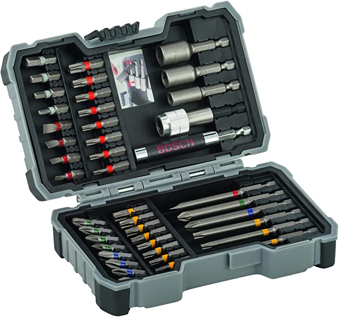 Phillips 25mm: PH1 / 2x PH2 / PH3, Phillips 75mm: PH2, Pozi 25mm: PZ1 / 2x PZ2 / PZ3, Pozi 75mm: PZ2, Slotted 25mm: 3mm / 4mm / 5mm / 6mm, Slotted 75mm: 5mm, Hex 25mm: 3mm / 4mm / 5mm / 6mm, Torx 25mm: T10 / T15 / 2x T20 / T25 / T27 / T30 / T40, Torx 75mm: T14 / T20 / T25, Tamperproof Torx 25mm: T10 / T15 / 2x T20 / T25 / T27 / T30 / T40, 1/4″ Nutsetter: 6mm / 8mm / 10mm, Porte-embout magnétique, Adaptateur magnétique à changement rapide.