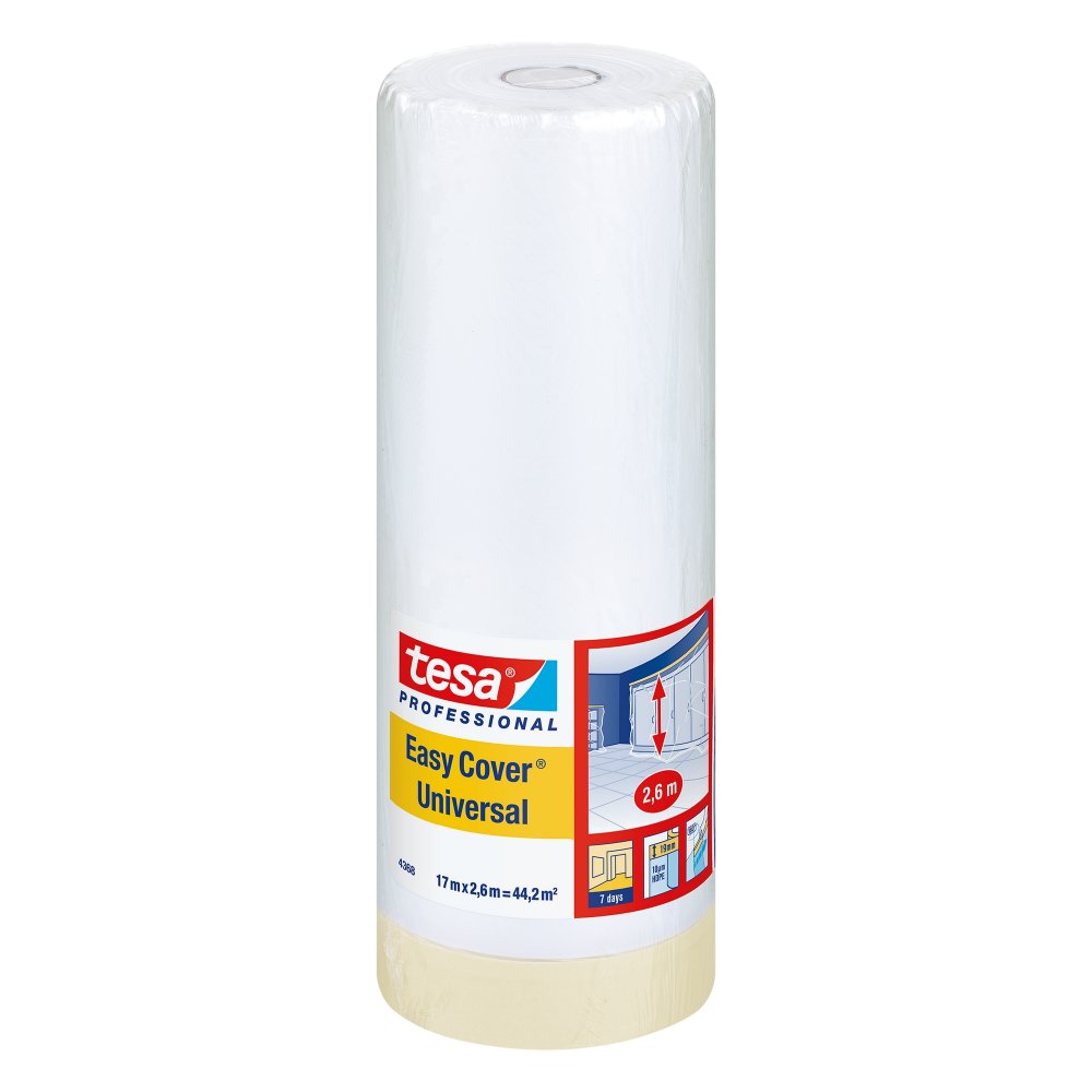 Un adhésif 2 en 1 : le Tesa® Easy Cover 4368 est la combinaison d’un film HDPE et d’un papier adhésif légèrement crêpé. Respectant l’environnement, il est idéal pour le masquage de surfaces importantes en un seul geste et en toute simplicité.