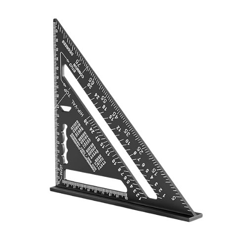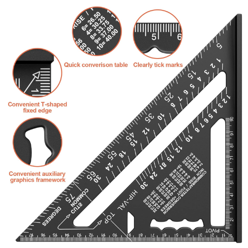 Fonctions multi-mesures : Charpentier triangulaire peut non seulement mesurer la longueur, mais aussi déterminer rapidement l’angle de 0 à 90 degrés. Sur le devant de la règle triangulaire, il y a également une table de conversion rapide qui vous permet de gagner du temps et d’améliorer l’efficacité du travail.