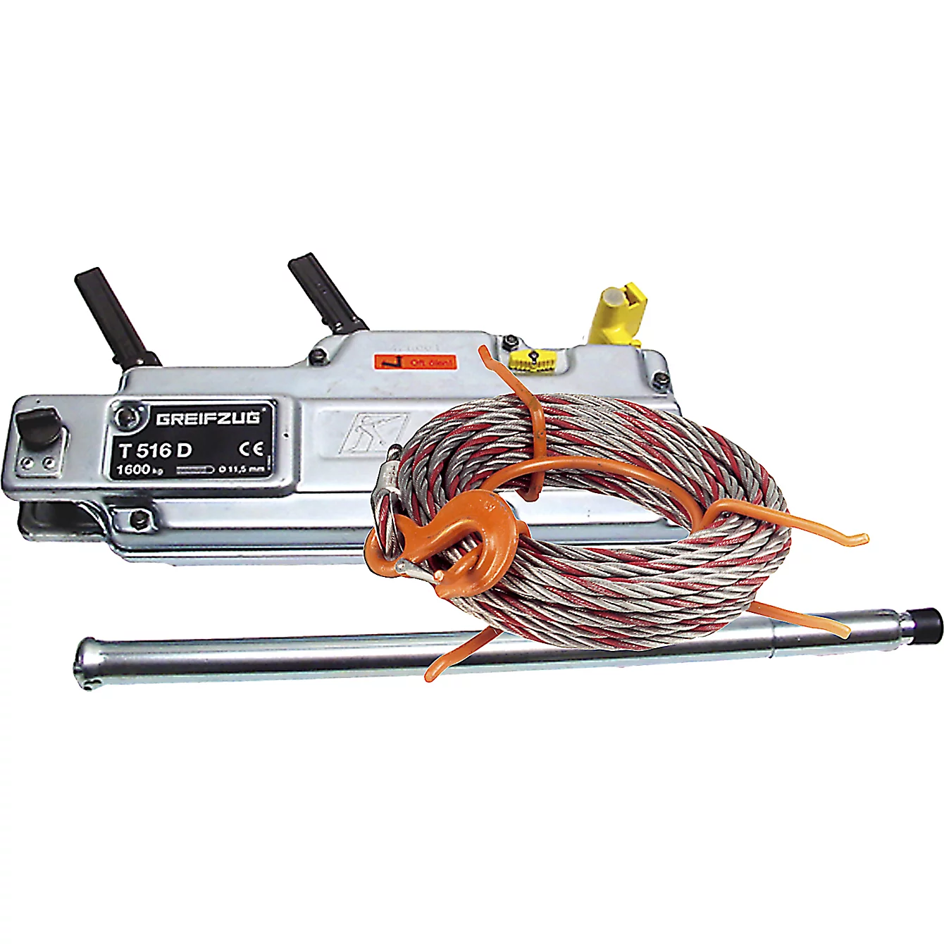 La longueur de câble (= trajet de traction) est pratiquement illimitée. Le mécanisme est autobloquant, le câble sous charge fait que les mâchoires se referment. Le tirefort non chargé peut être mis hors tension. Le câble peut ensuite être inséré et tendu manuellement puis retiré une fois les travaux achevés.